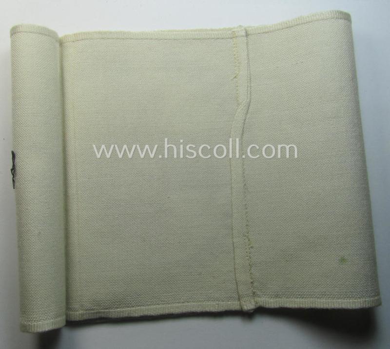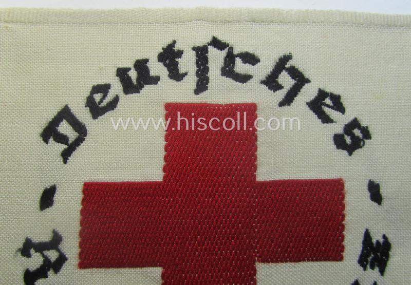 Linnen-based- and/or neatly 'machine-embroidered', beige-white-coloured DRK- (ie. 'Deutsches Rotes Kreuz'-) armband (ie. 'Armbinde') as was intended for the staff-members serving with the: 'Deutsches Rotes Kreuz' (or: German Red Cross)