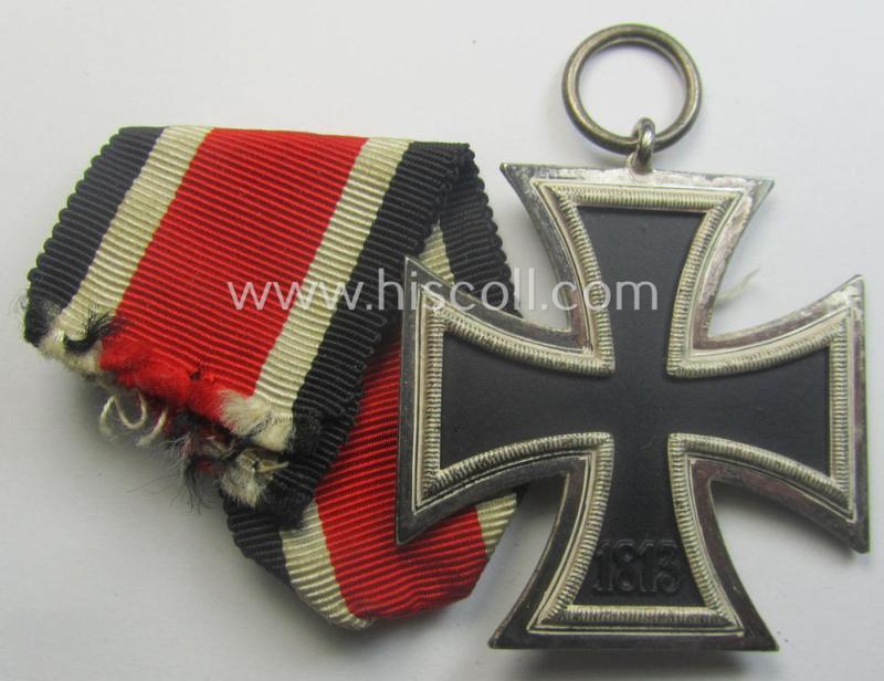 The attractive piece - which was surely issued but that was (I deem) simply never worn nor used - came together with its pre-folded and/or confectioned (and approx. 14 cms. long-sized) ribbon (ie. 'Bandabschnitt'). The cross - which is totally void of a stamped makers'-designation into its ring (as can be noticed on the pictures) - was with certainty never cleaned and has a superb and/or attractive (ie. 'frosted') age-patina: it truly retains almost all of its so-called: 'hochpolierte Kanten' (or: polished sides) and has a minimally darkened- (ie. hardly 'blackened'- ie. stained) finish (as can be seen on the pictures). The cross has a very nicely preserved, black-finished (ie. somewhat 'satin-like'- ie. somewhat matted-) core: it is totally void of any damage nor paint-loss (as can be seen on the pictures). The piece is just a tiny bit dusty and/or stained but was never cleaned nor polished. The cross is (I deem) an evident specimen that was produced by the desirable maker: 'Rudolf Wächtler & Lange' as was based in the town of Mittwaida in Sachsen (ie. 'Hersteller 100'): it has very nice and/or pronounced detail as to be expected for a cross by this desirable maker. The IC was recently found at a German private-household and was never before in collectors'-hands. Simply a superb, non-maker-marked 'EK II. Klasse' that is with certainty accordingly priced!