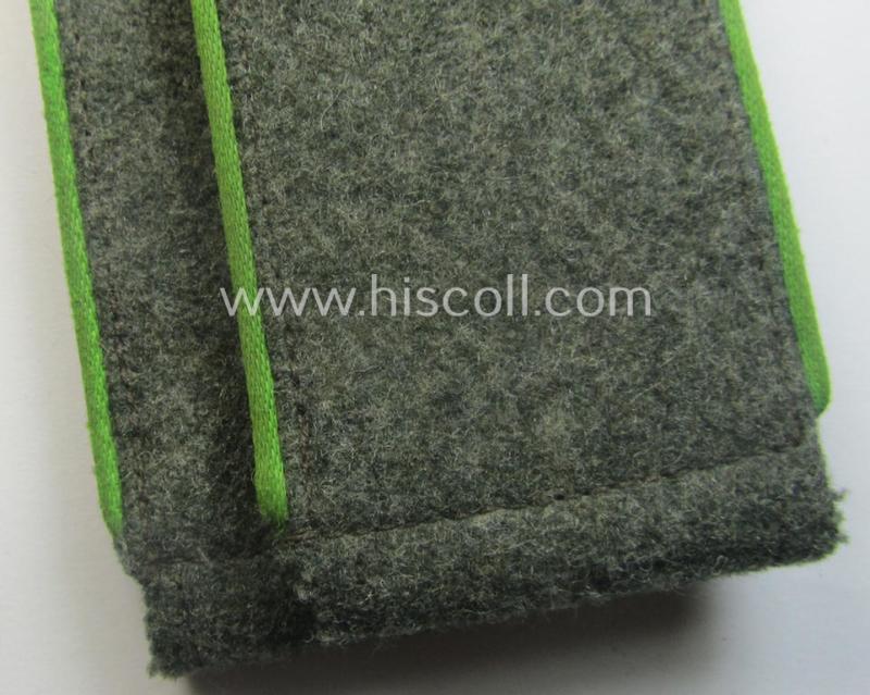 This is a truly very attractive - fully matching and with certainty scarcely found! - pair of WH (Heeres) (I deem) mid-war-period- (ie. 'M41- o. M43'-pattern-) enlisted-mens'-type shoulderstraps as was piped in the desirable bright-green- (ie. 'wiesen- o. hellgrüner'-) coloured branchcolour as was intended for usage by a: 'Soldat der Panzer-Grenadier-Truppen' (ie. simple soldier who served within an infantry-related, so-called: rifle-regiment ie. unit) and that comes in an overall very nice- (albeit I deem just minimally used- and/or worn-), condition. The neat shoulderstraps - which measure 10,3 cms. sized in length - have the typical field-grey-coloured- and/or woolen-based 'upperdecks' and have the neat (and desirable!) bright-green- (ie. 'wiesen- o. hellgrüner'-) coloured- and/or desirable 'silk-like'-type, piping, attached (as can be noticed on the pictures). The straps come naturally mounted onto their functional tongues and do show minimal wear, usage and/or moderate age (as can be noticed on the pictures). Simply an attractive - and actually scarcely found! - EM-type 'Panzergrenadiere'-shoulderstrap-pair that comes in a truly worn- and/or fully untouched, condition!