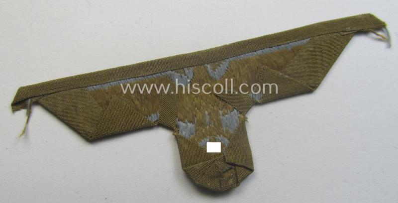 The attractive example on offer here is neatly light-blue-coloured (as to be expected) and was executed onto a (typical) tropical-pattern, brownish- (ie. typical tan-) coloured and/or: linnen-based background as to be expected. The piece comes - as stated above - in a nicely pre-confectioned- ie. folded but nevertheless truly 'virtually mint- ie. unissued'- and/or never cap-attached (as can be noticed on the pictures). The side-cap eagle (ie. 'Tropen-Mützenadler für Schiffchenmützen- o. Einheitsfeldmützen') is just a tiny bit stained ie. wrinkled caused by years of storage but has maintained very nice detail, overall. The piece can as such perfectly serve to restore any tropical 'Schiffchen' (or even: 'Einheitsfeldmütze'). These 'tropical-issue-' (ie. DAK- or 'Deutsches Afrika Korps'-related-) cap-eagles can noways easily be graded 'scarce' and come actually not that often offered for sale!