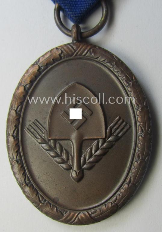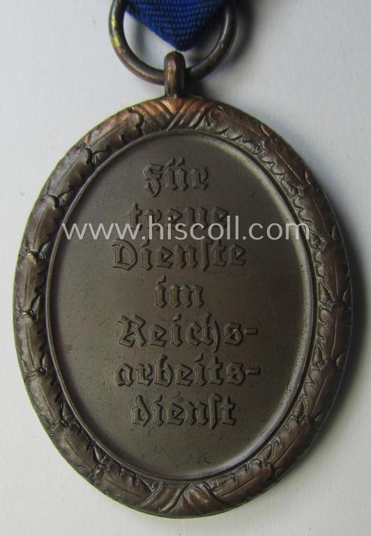 The attractive - and I deem just moderately used and/or hardly worn! - RAD-loyal-service-award (ie. 'Dienstauszeichnung für Männer der 4. Stufe in Bronze') is of the 'light-weight'- (ie. darker-bronze-toned- ie. aluminium- ie. 'Cupal'-based) version - truly retains gorgeous details and has a great ie. only minimally darkened- (ie. somewhat tarnished) age-patina: it retains all of its darker-bronze-toned finish and has most certainly never been cleaned nor polished (as can be seen on the pictures). The piece comes firmly mounted onto its typical period, broader-sized- and/or cornflower-blue-coloured ribbon (ie. 'Bandabschnitt') as issued and/or presumably worn. Simply a very attractive and typical 'Cupal'-based example of a: 'RAD-Dienstauszeichnung 4. Stufe für Männer' that is accordingly priced!