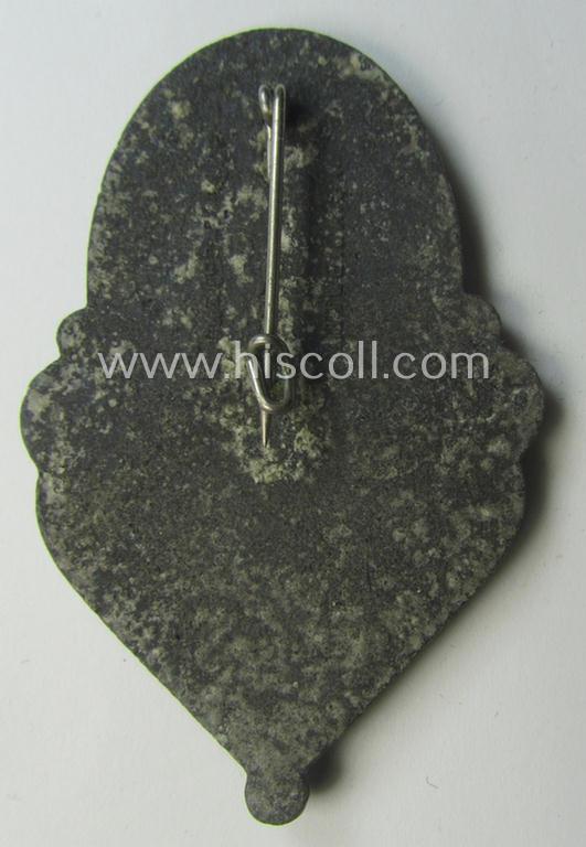 The neat commemorative - and with certainty desirable! - day-badge (ie. 'tinnie' or: 'Veranstaltungsabzeichen') is executed in (molded-styled) silverish-grey-coloured- (ie. I deem aluminium-based) metal: it shows some normal wear and/or moderate age but has, nevertheless, been nicely preserved over the years. The (shield-shaped) badge comes naturally mounted onto its functional pin- ie. catch set-up and has (I deem) never been cleaned nor polished: it shows some minimal age ie. staining (as can be seen on the pictures). The (shield-shaped) 'tinnie' is quite detailed and retains most of its minimally tarnished, silverish-grey-coloured finish. It is void of a makers'-designation on its back and shows a detailed illustration of 3 upward-positioned swords and 6 symbols (ie. logos) of various TR-related organisations (such as the: SS and/or RAD to mention a few) coupled with the above-mentioned text. It should be noted that all N.S.D.A.P.-related tinnies that were intended to commemorate an event at regional- (ie. 'Kreis'- or: 'Gau'-) level (such as the piece on offer here) saw much more limited usage and can easily be graded 'scarce'. Simply a neat - and actually not that often seen! - N.S.D.A.P.-related 'tinnie' that is I deem accordingly priced!