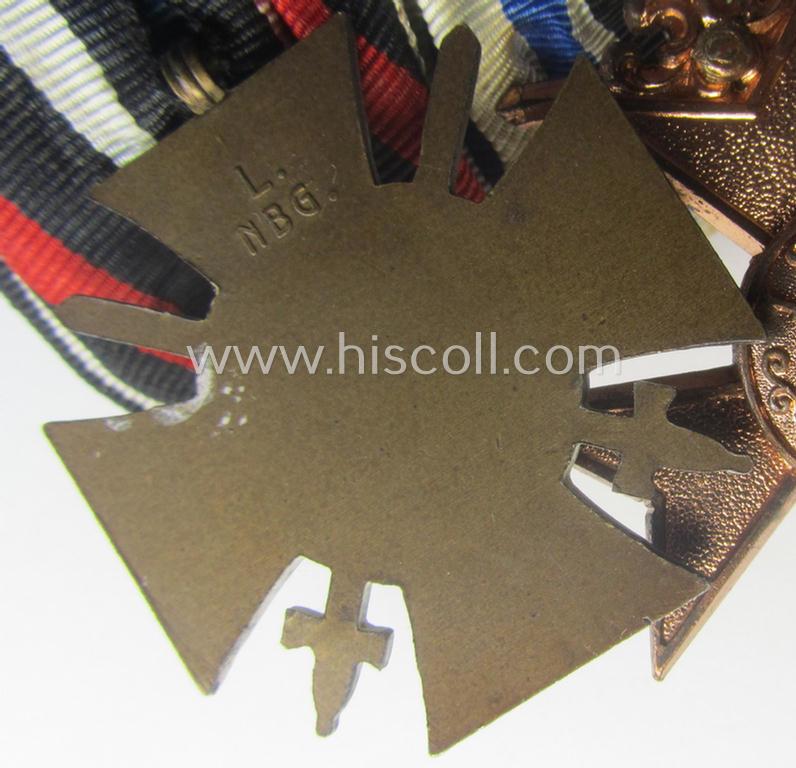 The 'Frontkämpferkreuz 1914-18 mit Schwertern' is a nicely preserved and clearly maker- (ie. 'L.NbG.'-) marked example that retains all of its (somewhat shiny) age-patina. The 'Ordenspange' comes naturally mounted onto its functional pin- (ie. catch-) set-up and is neatly 'backed' with a piece of light-green-toned wool (as can be seen on the pictures). The medal-bar was recently found at a private-household in Germany and was never before part of a collection. The 'Spange' is most certainly a period-compiled- and/or worn piece and is NOT a post-war compilation or alike: it originated as stated above from a private-household and was kept as such for decades. Simply a very attractive - and decorative! - 4-pieced, WWI- (ie. Third Reich-) related medal-bar- ie. 'Ordenspange' that is I deem with certainty accordingly priced!