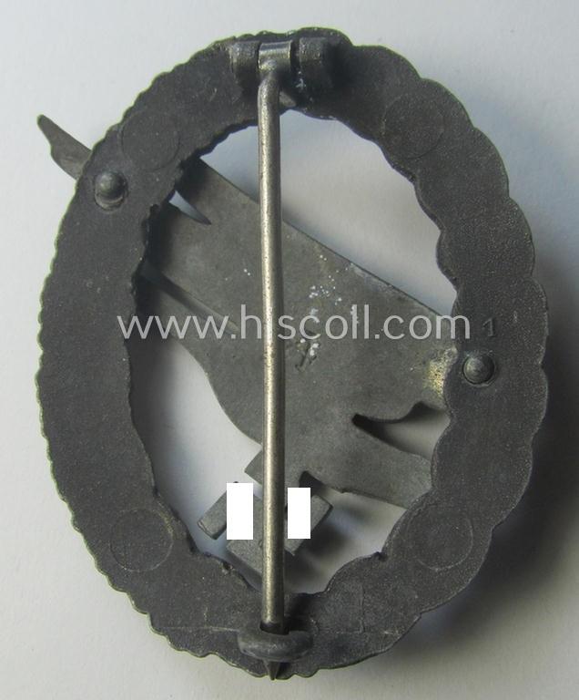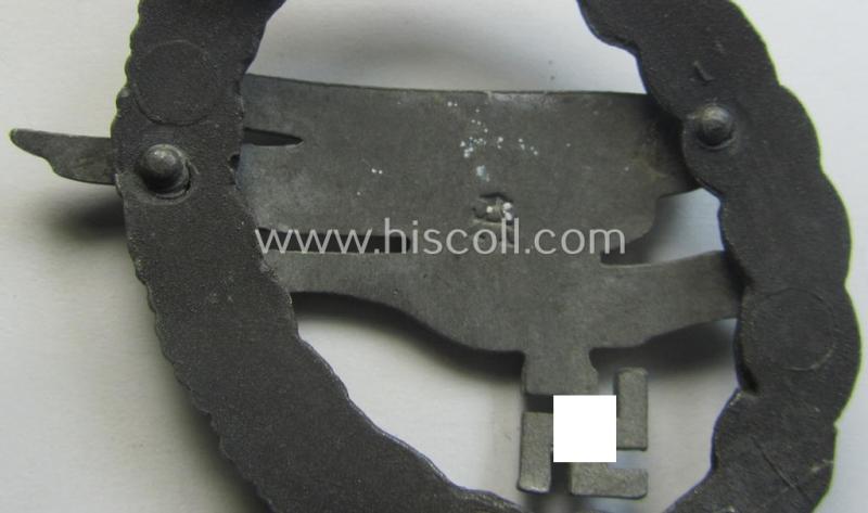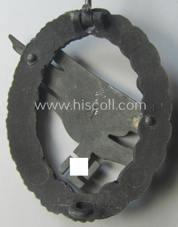 This is an attractive - and with certainty somewhat later-war-period! - so-called: zinc- (ie. 'Feinzink'-) based version of a WH (Luftwaffe) 'Fallschirmschützen-Abzeichen' (or: paratroopers-war-badge) being a clearly maker- (ie. 'A'-) marked example as was with certainty produced by the: 'Assmann & Söhne'-company and that comes in an overall very nice- (albeit just moderately used- ie. worn-), condition. The neat and detailed badge - which as stated above has been moderately worn - comes naturally mounted onto its functional pin (ie. set-up) and/or catch (ie. catch set-up). These later-war-period, 'molded' badges show a 'loose' and/or detailed eagle-device attached (by means of two rivets as is visible on the back of the badge). These zinc-based badges show, however, nice and/or pronounced detail overall. The badge truly retains its period (albeit as more often faded) silverish-golden-coloured finish and does show a somewhat tarnished age-patina as is more often encountered. The badge shows a clearly impressed 'A'-makers'-mark-designation (and/or: '1'-mold-marking) on its back and can with certainty be attributed to the maker: 'Assmann & Söhne': all specific details corroborate this. A similar example is also described in the excellent reference-book entitled: 'The German Luftwaffe & Heer Paratrooper Badges of World War II - 1936-1945' by my friend Thomas M. Durante wherein this particular pattern is given the unique reference-designation: 'Zinc - Die Struck Wreath -Type G'-variant. Simply an attractive - and garuanteed original! - later-war-period, zinc- (ie. 'Feinzink'-) based 'Assmann'-pattern of this desirable Luftwaffe-war-badge that is (I deem) accordingly priced!