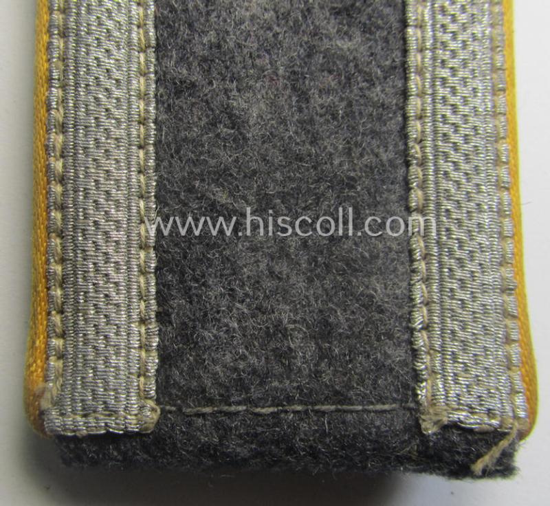 This is a neat - albeit regrettably single - mid- (ie. later-) war-period and 'standard-issued' WH (Heeres) NCO-type shoulderstrap as piped in the golden-yellow- (ie. 'goldgelbener'-) coloured branchcolour as was specifically intended for usage by an: 'Unteroffizier der Flieger o. Fallschirm-Truppen' (or: NCO ie. junior-sergeant who served within the pilots'- or paratroopers'-branch) and that comes in an overall nice- (ie. clearly used- ie. worn and/or carefully tunic-removed-), condition. The shoulderstrap - which measures approximately 10 cms. in length as more often seen - has the neat, golden-yellow- (ie. 'goldgelbener'-) coloured and/or desirable 'silk-like'-type piping attached (as is more encountered with these mid- ie. later-war-period shoulderstraps). The strap - which does show evident age, wear- and/or staining - does show the 'standard'-issue- (ie. LW-dotted-pattern, silverish-coloured- (ie. somewhat sub-dued) NCO-braid period-attached and comes mounted onto its functional tongue (as can be seen on the pictures). Simply a neat - and/or fully 'text-book' NCO-type 'Flieger o. Fallschirm-Truppen'-shoulderstrap that was intended for usage by an: 'Unteroffizier der Flieger o. Fallschirm-Truppen'!