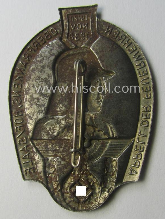 Commemorative, hollow-back- and/or silverish-grey-toned, so-called: 'Feuerwehr'-related day-badge (ie. 'tinnie') as executed in zinc-based-metal that is showing the text: 'Appell der Feuerwehren Oberfrankens - Hof/Saale - 19./20. November 1938'