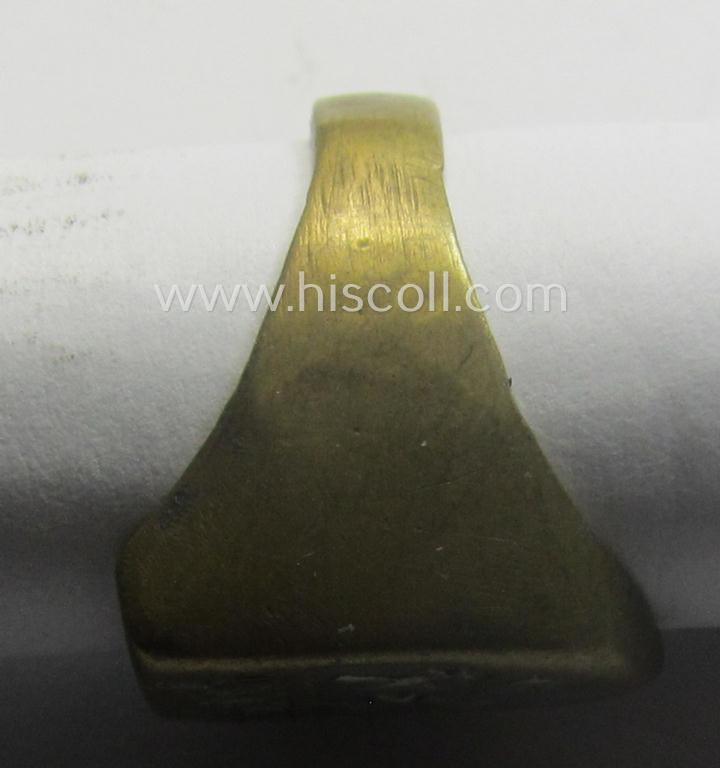 The neat - and with certainty male-type- and somewhat larger-sized - finger-ring is I deem executed in somewhat tarnished- and silver-coloured (and copper-based) metal and retains great pronounced detail. As more often, is it totally void of a makers'-designation or alike. The ring is clearly worn ie. used (it is still a bit tarnished and has lost most of its silver-toned finish: it was, however, with certainty never cleaned nor polished). The detail on the engraved ie. molded illustration is, however, nicely preserved and void of any damage or alike (as can be seen on the pictures). The piece originates with certainty of a local production and was most certainly acquired as a souvenir before or during the war. These 'souvenir'-rings could be privately purchased from local artisans and were very popular amongst the troops. Simply a neat and 100% genuine example that originates from a German private-household where it was recently uncovered. I deem that I have priced this 'Gegen Engeland'-souvenir-ring, accordingly!