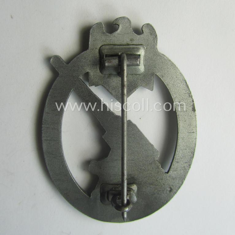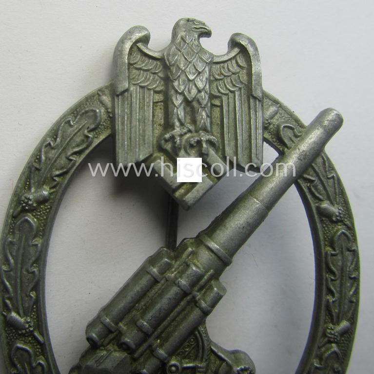 This is a very attractive - and actually quite rarely encountered! - example of a so-called: 'Heeres-Flakkampf-Abzeichen' (or: army anti-aircraft war-badge) being a non-maker-marked- and/or zinc- (ie. 'Feinzink'-) based specimen of the so-called: 'pillow-crimped'-pattern as was produced by a to date unidentified maker and that comes in an overall very nice- (ie. I deem hardly used- nor worn-), condition. The badge on offer here concerns a later-war-period, typical zinc- ie. 'Feinzink'-based specimen that retains most (ie. all!) of its (fairly shiny!) silver-coloured finish and has maintained an attractive appearance, still showing pronounced detail as to be expected. The badge is truly converse-shaped and has never been cleaned nor polished (and is still also a tiny bit dirty ie. stained- ie. tarnished as mentioned above). As stated above, does it deal with a so-called: 'pillow-crimped'-pattern that naturally shows all the details as to be expected for a badge by this particular maker. Simply a very attractive and honest 'Heeres-Flakkampf-Abzeichen' of the so-called: 'pillow-crimped'-pattern that comes in an overall very nice condition: it will be very hard to upgrade this specimen!
