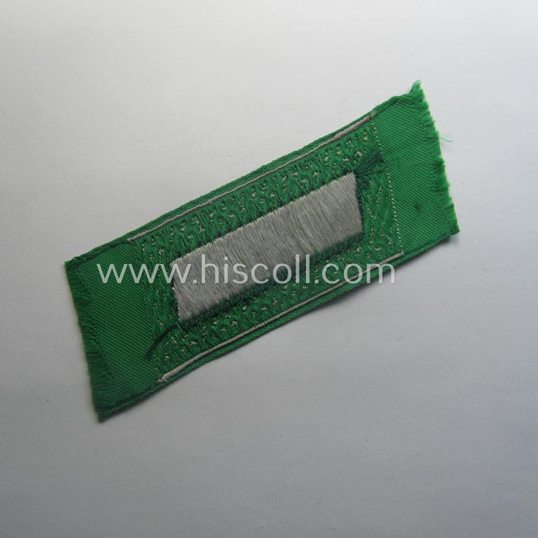 The neat - albeit regrettably single - collar-tab (ie. 'Kragenspiegel') - which is nicely and entirely executed in the so-called: 'BeVo-weave technique' - is piped in the bright-green- (ie. 'grüner'-) coloured branchcolour, being the designated branchcolour as was given to the: 'Aserbaidschanischer'- (ie. Aserbaidschanian-) volunteers serving within the 'Deutsche Wehrmacht'. The piece came in a non-folded nor trimmed condition and came as 'straightly cut-off the role': it show the neatly interwoven, silver-grey-coloured 'NCO'-braid denoting that is was intended for a soldier ie. NCO with the (non-commisioned-officers'-rank) of a: 'Zugführer'. The tab was simply never used nor tunic-attached but does show some minimal age and/or minimal staining. It should be noted that these original, 'officially German-issued' collar-tabs as entirely executed in 'BeVo'-type weave (ie. being of the German manufacture by the company of 'BeVo'!) can easily be graded 'very scarce'. I deem that this attractive 'Ostvölker'- ie. 'Aserbaidschanischer'-volunteers-collar-tab is accordingly priced!