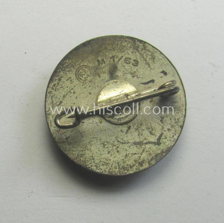 This is a very attractive and fully undamaged(!) - I deem early- (ie. even pre-war-) period example of a HJ ('Hitlerjugend') so-called: 'HJ-Schiessauszeichnung für Scharfschützen' (or: HJ shooting- ie. marksmans'-badge with oakleaf-wreath) being a nicely maker- (ie. 'RzM - M1/63'-) marked example that comes in an overall nice- (I deem surely issued- and/or just moderately worn-), condition. The smaller-sized badge (which is equally sized as an N.S.D.A.P.-membership lapel-pin) is as stated above, neatly marked on the back with the makers'-designation 'RzM - M1/63' as mentioned above. The lapel-pin was never cleaned (some age ie. staining is present) but the piece truly shows no enamel-damage whatsoever (it was most certainly never cleaned nor polished and shows a somewhat tarnished, typical silver-coloured finish). The badge comes naturally mounted onto its fully functional (and unaltered) pin- ie. pin-catch set-up. The piece originates from a German private-household where it was recently found and was never before part of any collection. Simply a neat - and actually not that often seen! - youth-related marksmans'-badge: hard to find a better and more nicely preserved example for a more interesting price!